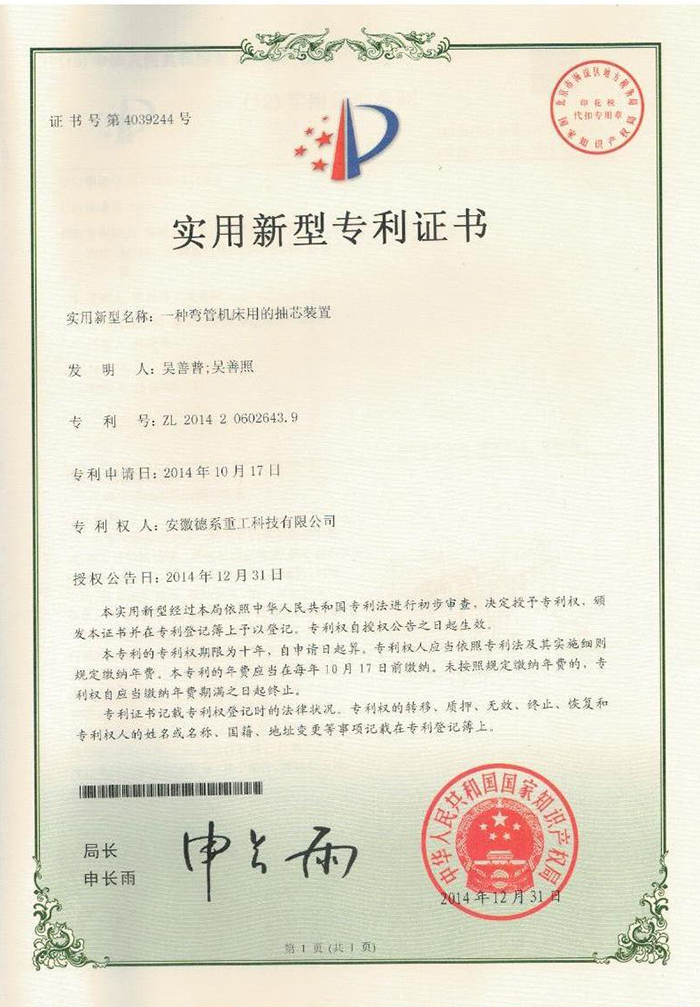 彎管機(jī)用抽芯裝置