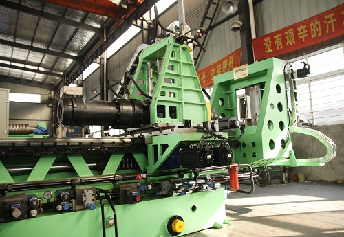 三、采用雙油缸引拽彎管鏈輪產(chǎn)生扭矩的彎管傳動結(jié)構(gòu),彎管油缸缸徑與桿徑比為2:1的大桿徑結(jié)構(gòu)具有極大的抗彎性,桿徑內(nèi)螺紋連接鏈條(實用新型專利)傳動平穩(wěn)可靠無脈動。返回復位油缸同樣具有大桿徑的優(yōu)點外更具有快速復位作用,返回復位速度是彎管速度的1.79倍,極大的提高了工作效率。