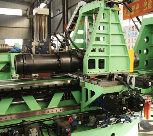1.小車抓料(炮筒)動作由內(nèi)置式空心結(jié)構(gòu)油缸推動15°彈性夾頭完成,結(jié)構(gòu)緊湊極穩(wěn)定,夾持力大,夾管時無管材位移現(xiàn)象(發(fā)明專利),夾管精度極高(小車在實現(xiàn)推彎或頂鐓作業(yè)時夾管無打滑現(xiàn)象)。
