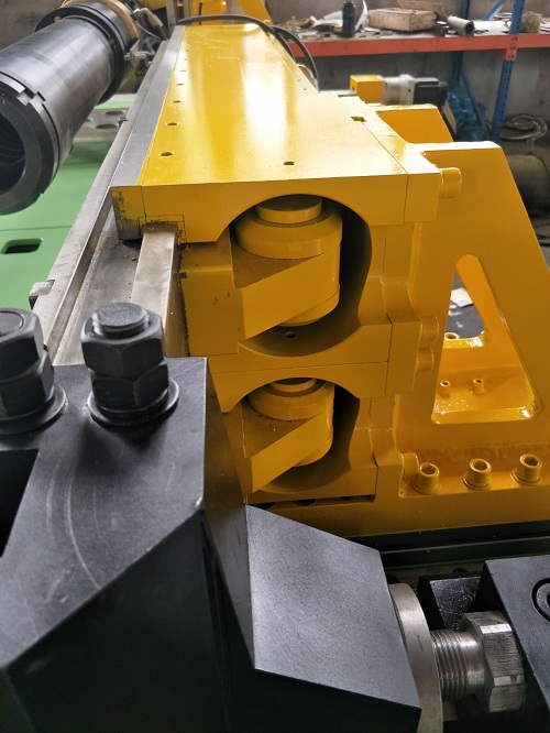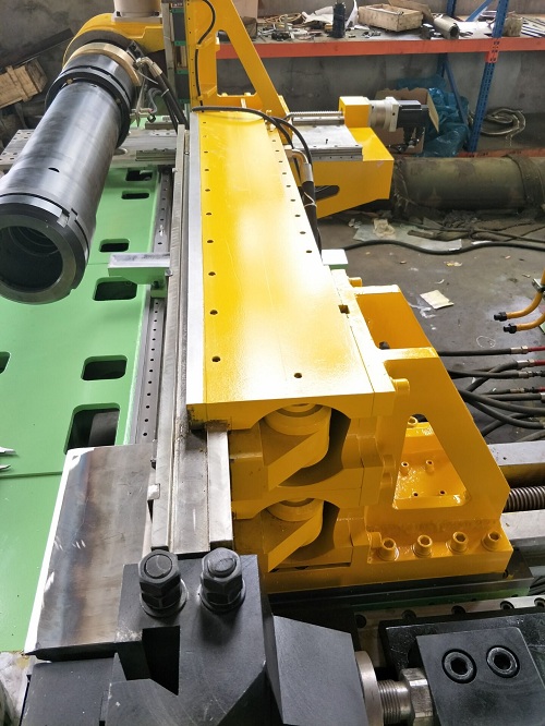 八、輔推油缸安裝在輔推架內(nèi)(頂鐓模塊的頂鐓油缸和頂鐓架為整體鍛造40Cr并調(diào)質(zhì)),輔推(頂鐓)油缸同等行程下有效減少輔推(頂鐓)機(jī)構(gòu)長度,避免了彎曲管件尾部因輔推(頂鐓)機(jī)構(gòu)長度帶來的直線段浪費。(注:頂鐓功能模塊為特殊附件,需另訂)九、抓料、轉(zhuǎn)角、送料小車安裝在獨創(chuàng)的三道軌床身上(數(shù)控型,NC型無此項):